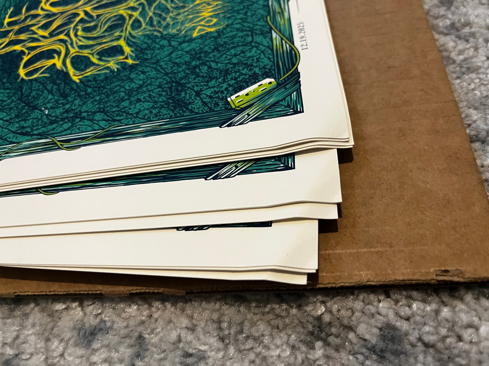 The prints sustained a small dent on the bottom left corner during shipping---please see close ups on this. Should frame out okay, but I have lowered the price. Thanks for your interest.